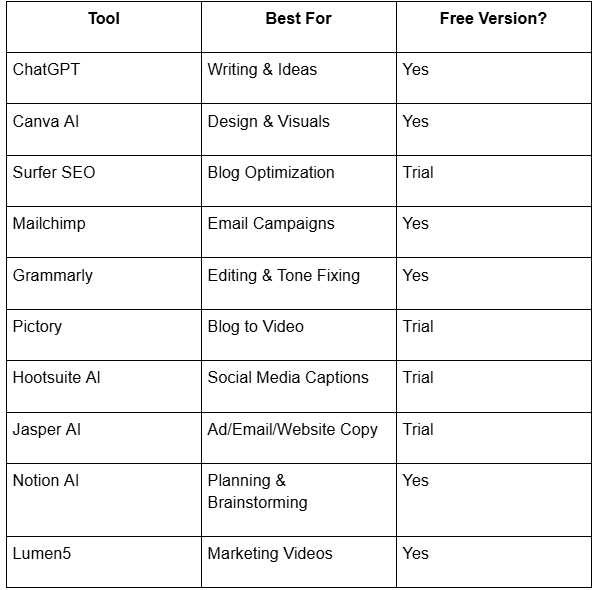 Ans: ChatGPT, Jasper, Canva, Mailchimp, Surfer SEO, Notion AI, Pictory, Lumen5, Grammarly, and Hootsuite are widely used.